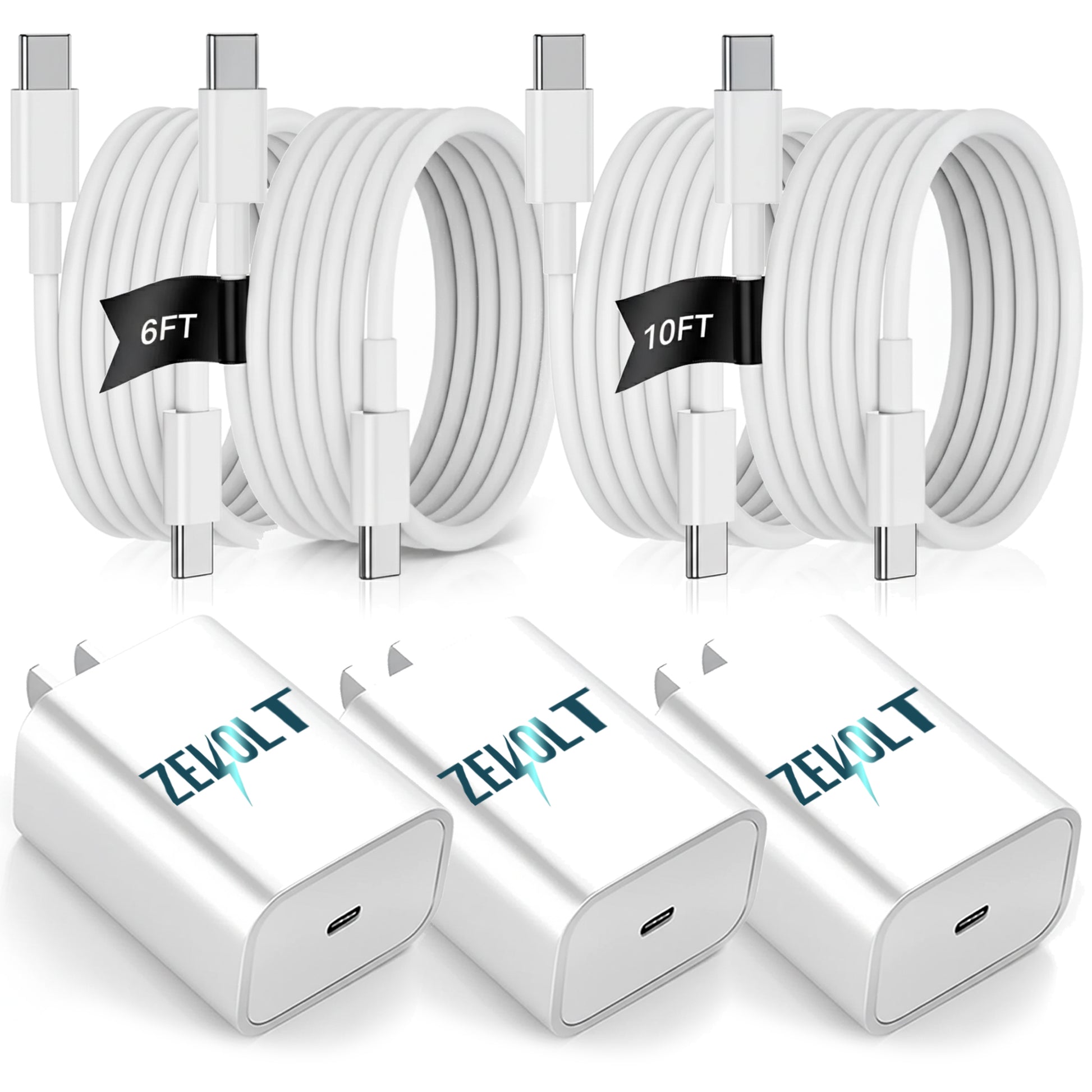 Zevolt USB C Charging Kit, 3 Wall Charger Blocks with 2 Pack 6ft and 2 Pack 10ft USB C to USB C Cables, Fast Charging Bundle